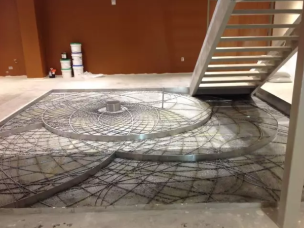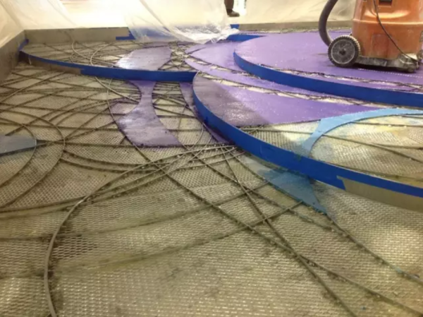 4.按要求固定好之后,下一步就是环氧磨石的铺装了(前提是按要求处理完地面)。按照色彩要求,严格有序的铺装磨石层。