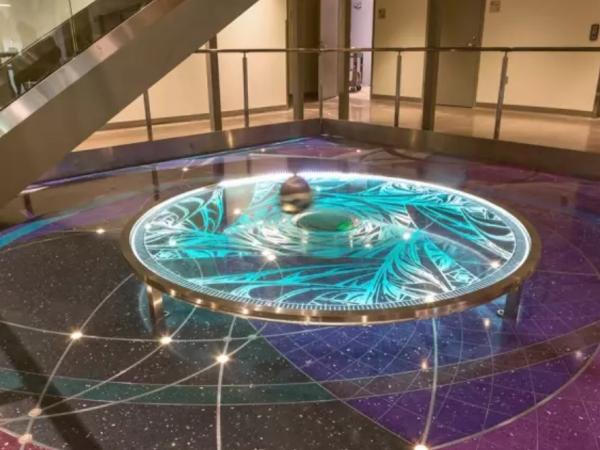 流光溢彩的玻璃灯,将别致的纹路浮于精彩的环氧磨石上,带着一点科技感,一点玄幻感,既点缀了地面的轻奢,又增强了空间的瑰丽!